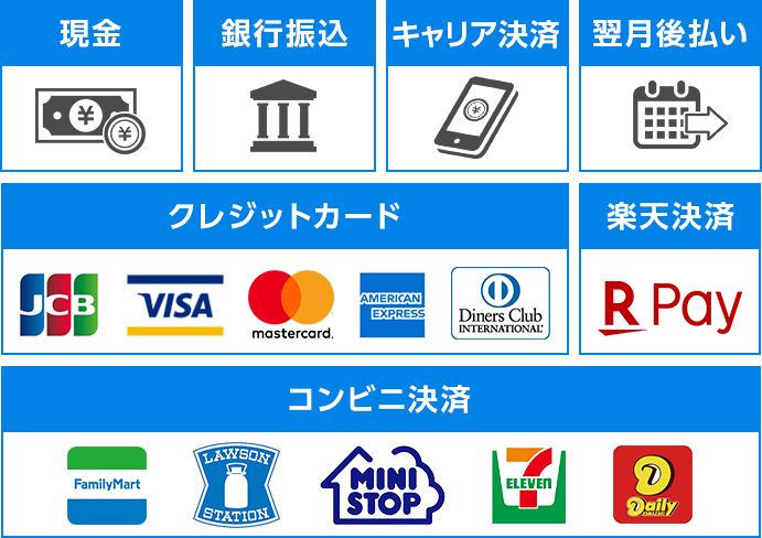 現金・クレジットカード・翌月後払い・キャリア決済・楽天決済・お振込み