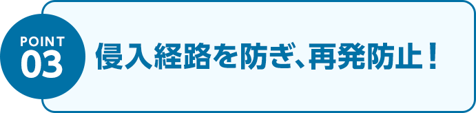 施工後は殺菌・消毒を行い、再発防止いたします。施工技術には自信がありますが、万が一再発した場合でも1週間のアフターフォローがついているので、安心してお任せください。