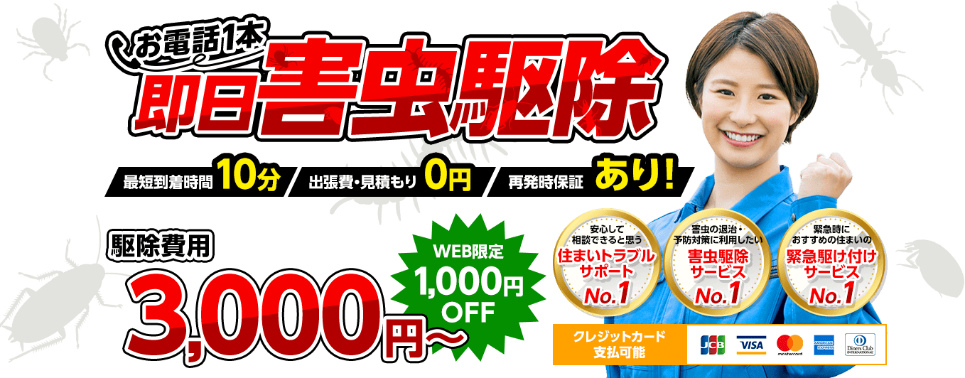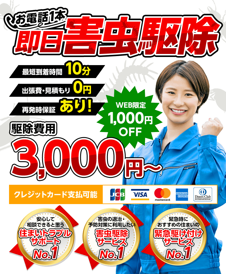 虫の種類や被害状況によって変動しますが、最低料金は3,000円~となります。まずは無料でお見積りさせていただきます。お見積り金額に追加で発生する費用はございませんのでご安心ください。お客様にご納得いただいてから作業に入ります。