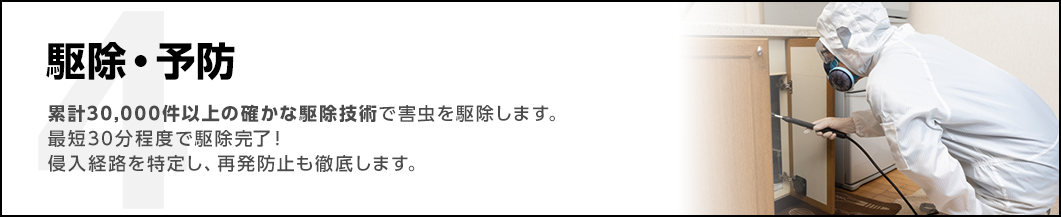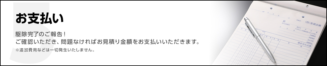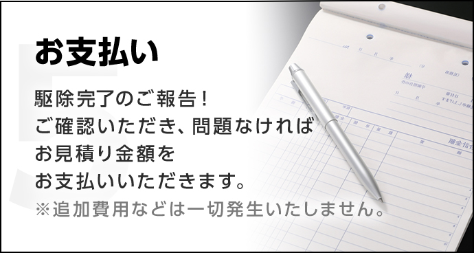万が一被害が再発した場合でも、無料で再度駆除させていただきます。駆除技術には絶対の自信がありますが、万が一の場合にもお客様にご安心いただけるよう心がけております。